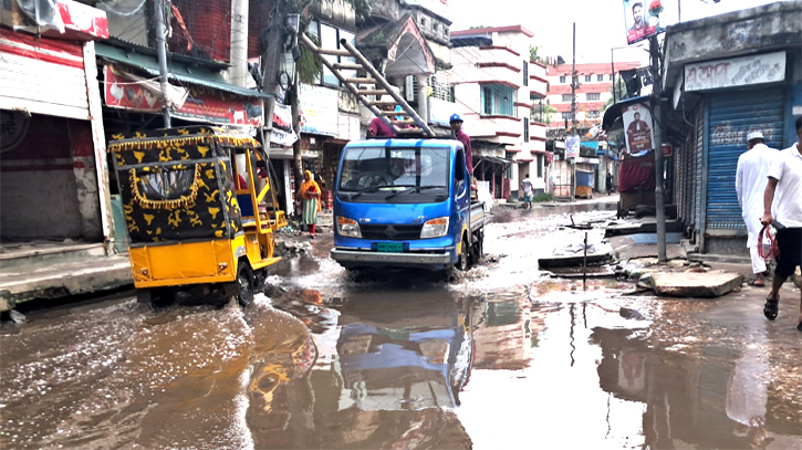 শুক্রবার (১ আগষ্ট) সকালে সরজমিয়ে গিয়ে দেখা গেছে রাস্তায় জমে আছে ময়লা কাদাযুক্ত হাটু পানি। আর এই পানি দিয়ে চলছে অটোরিক্সা, প্রাইভেটকার, মোটরসাইকেল সহ ও কন্টিনারের মতো ভারী যানবাহন।